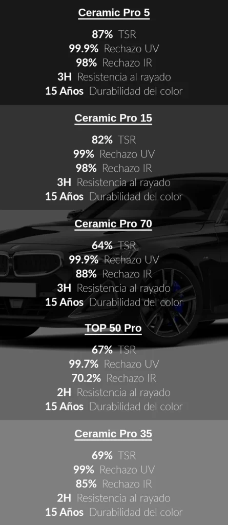 La Línea Pro Film de Solar Pro está desarrollada con tecnología nanocerámica multicapa, diseñada para ofrecer el máximo rechazo de calor, claridad óptica y durabilidad. Es la mejor opción para quienes buscan confort, protección y un acabado premium en sus vehículos.
